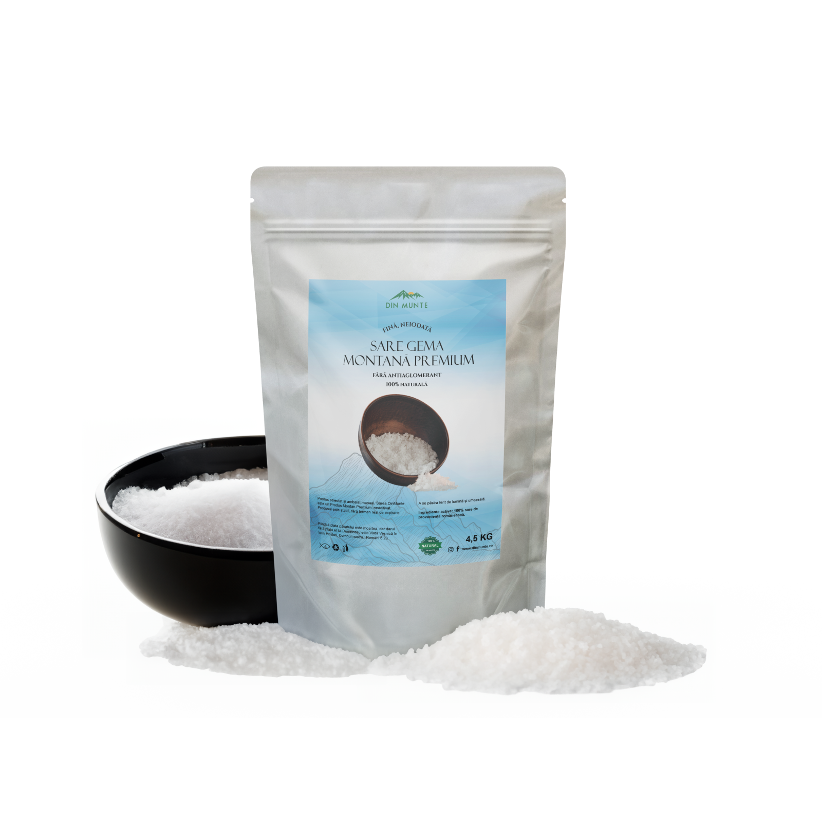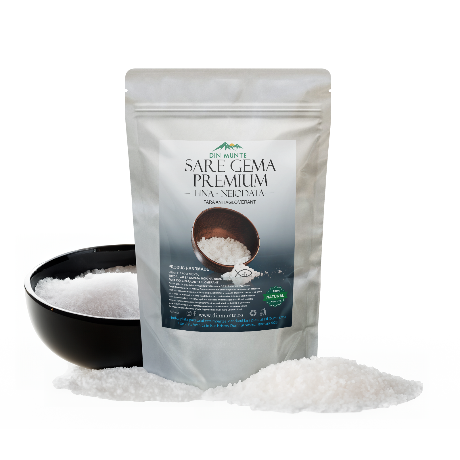 Sarea premium, neiodată și fără antiaglomerant, este extrasă direct din rocă, dintr-un zăcământ natural. Procesată, prelucrată, selectată și ambalată manual, aceasta conține 98-99% NaCl. La DinMunte.ro găsiți singura sare premium fără iod și fără ferocianură de potasiu.